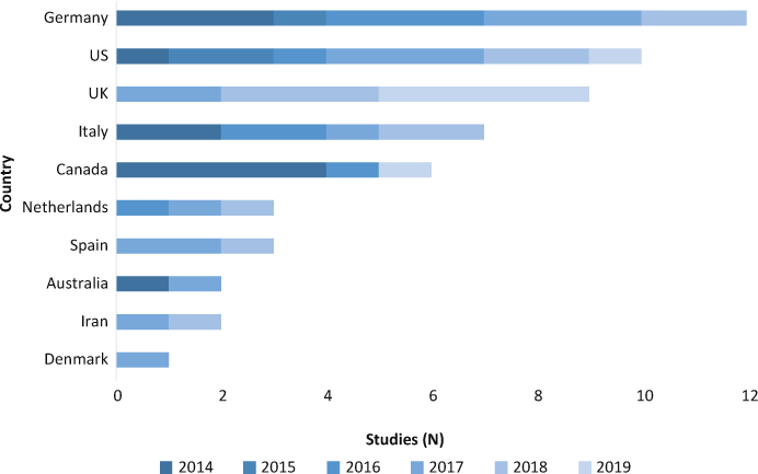 We included 55 studies (Table S1, Figure S1), mostly conducted in Europe (63%), followed by the United States and Canada (29%), Australia (4%), and Asia (4%). Among European countries, figures were higher for Germany (22%), the United Kingdom (16%), and Italy (13%) (Figure 1). Most of the studies (60%) were published between 2017 and 2019, with a peak of 28% (15 of 55) in 2017. Overall, three studies (5%) were randomized controlled trials (RCTs), with the others being observational (27 of 55 [49%]), qualitative (11 of 55 [20%]), mixed-methods (9 of 55 [17%]), quasi-experimental (3 of 55 [5%]), and reviews (2 of 55 [4%]).