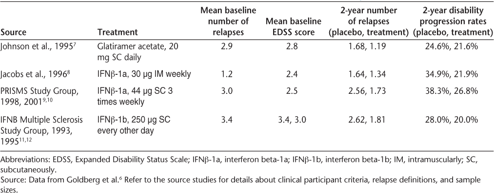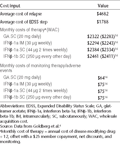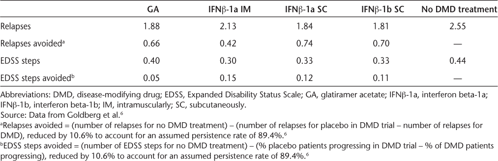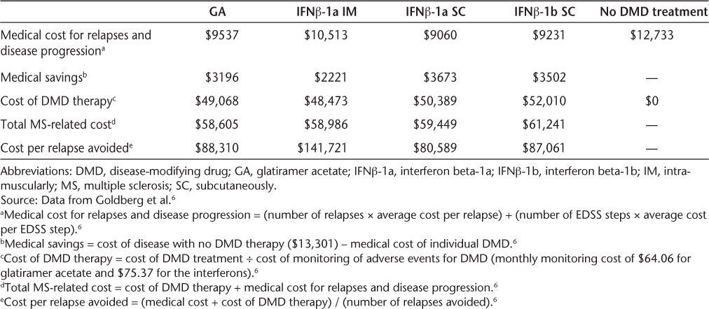 In a 2009 publication entitled “Comparing the cost-effectiveness of disease-modifying drugs for the first-line treatment of relapsing-remitting multiple sclerosis,” Goldberg et al.6 constructed an elaborate economic model to analyze the cost-effectiveness of four first-line therapies for MS. They used data from pivotal randomized placebo-controlled clinical trials (RCTs) to determine the most cost-effective therapy, defined as the therapy with the most favorable cost per relapse avoided over a 2-year period. The DMDs studied were GA (Copaxone), IFNβ-1a IM injection (Avonex), IFNβ-1a SC injection (Rebif), and IFNβ-1b SC injection (Betaseron).