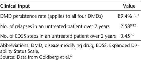 Treatment response was measured in terms of the number of relapses and disability progression steps avoided over the 2-year period. The study adopted the Schumacher definition of relapse: “the appearance of a new symptom or worsening of an old symptom persisting over at least 24 hours. The abnormality is preceded by stability of improvement for at least 30 days and is confirmed by a neurologist to be attributed to MS activity within 7 days.”15 Based on trends observed in two RCTs,9 12 an average untreated patient can expect to experience 2.58 relapses over a 2-year period (undiscounted). Disability progression steps observed are in accordance with the Kurtzke Expanded Disability Status Scale (EDSS), which ranges from 0 to 10, with 0 indicating no disability and 10 indicating death from MS. Based on trends observed in three RCTs,7–9 an average untreated patient can expect to experience 0.45 disability progression steps over a 2-year period (undiscounted). Clinical input parameters are outlined in Table 2.
