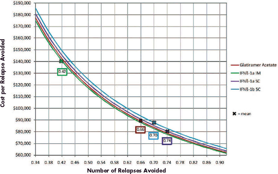 A second key finding depends on the assumption that the four first-line DMD therapies are equally effective in terms of preventing relapses. In this case, we consider the cost-conscious consumer—that consumer who rationally and wisely wishes to minimize the cost of therapy since all treatments are presumed equally effective. For this cost-conscious consumer, the optimal therapy is IFNβ-1a IM (Avonex), the therapy plotted as the innermost curve (closest to the point at which the x and y axes intersect). In this instance, IFNβ-1a IM would be equally effective as competing therapies in terms of avoiding relapses but would carry a lower cost to the patient for all numbers of relapses avoided over the identified relevant range. For this cost-conscious consumer, the ranking of most (1) to least (4) preferred DMD therapies is 1) IFNβ-1a IM (Avonex), 2) GA (Copaxone), 3) IFNβ-1a SC (Rebif), and 4) IFNβ-1b SC (Betaseron).