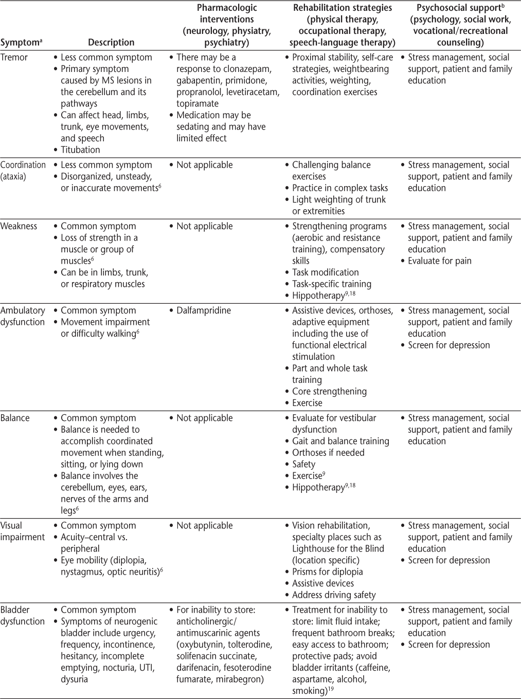Symptoms and recommended interventions for patients with multiple sclerosis3–7