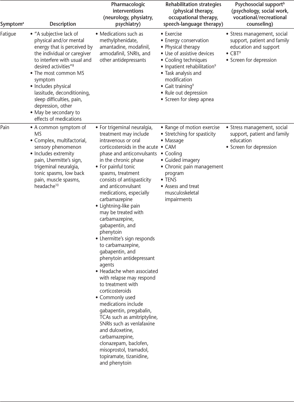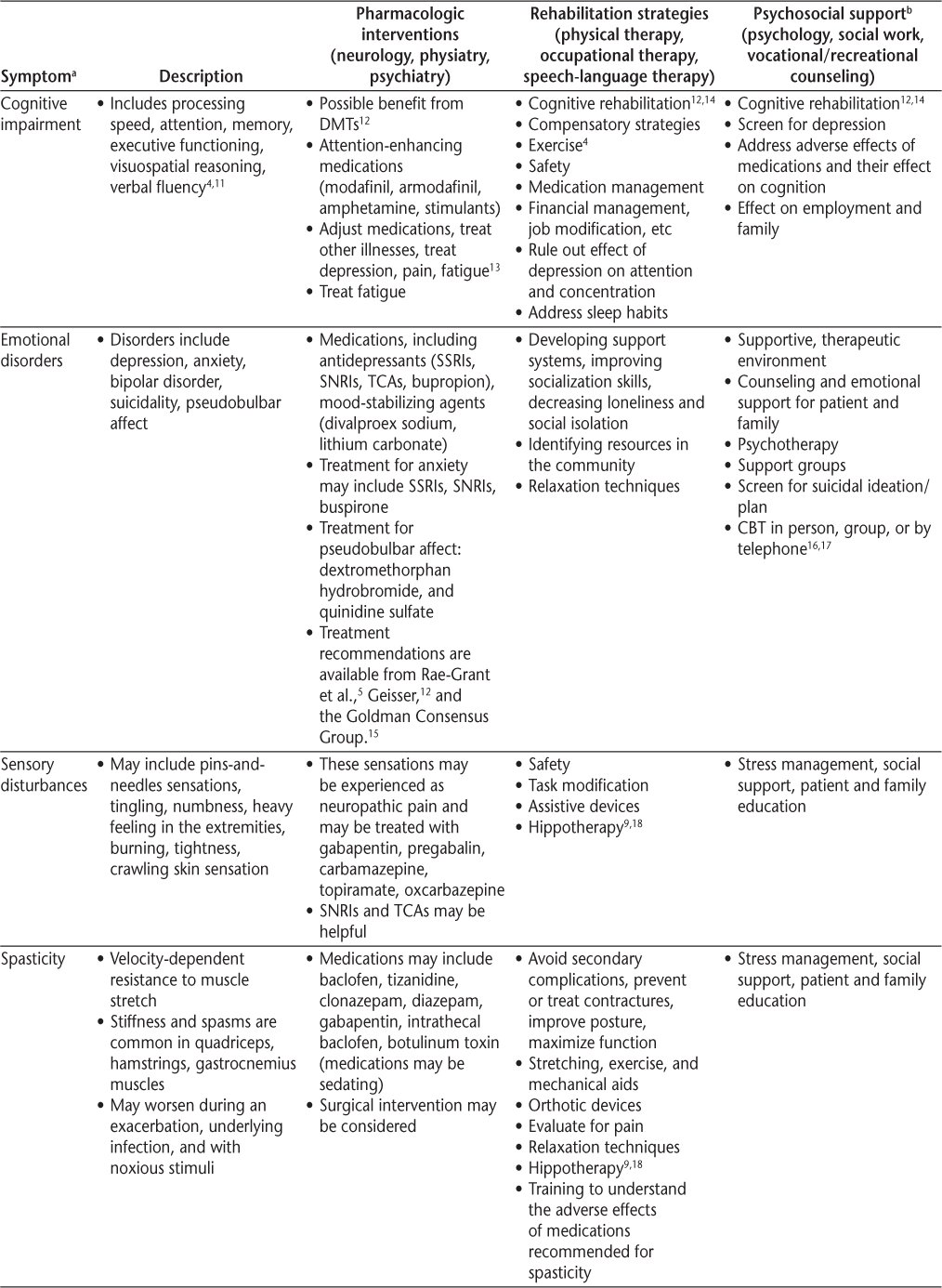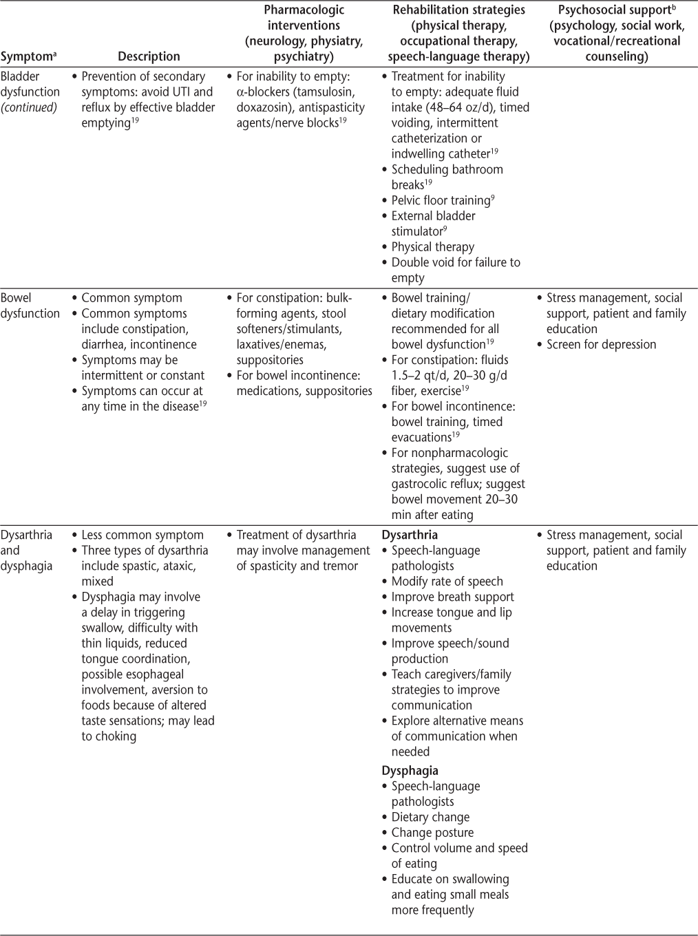 Symptomatic management is a cornerstone of comprehensive care and should use some combination of pharmacologic interventions, rehabilitation, psychosocial support, education, and counseling (Table 2). Priority should be given to symptoms that may cause substantial morbidity or mortality (depression, trauma from fall, aspiration pneumonia from dysphagia, infection from skin breakdown, or neurogenic bladder). Beyond this, it is important to help people with MS prioritize symptoms, provide individualized care, and consider the family and significant others in treatment decisions. Defining and understanding symptoms is the first step toward a goal of optimal function and improved quality of life (QOL). It is also important to consider vocational issues for people with MS and to periodically assess for wellness to allow them to achieve the best QOL possible.3 The Framework Taskforce strongly encourages referral to specialists for appropriate treatment when necessary.