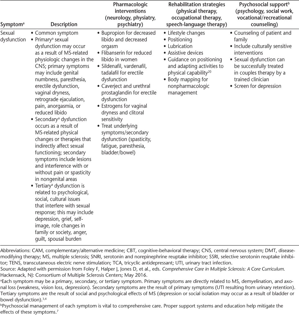 The Consortium of Multiple Sclerosis Centers (CMSC) convened a Framework Taskforce composed of a multidisciplinary group of clinicians and researchers to examine and evaluate the current models of care in multiple sclerosis (MS). The methodology of this project included analysis of a needs assessment survey and an extensive literature review. The outcome of this work is a two-part continuing education series of articles. Part 1, published previously, covered the updated disease phenotypes of MS along with recommendations for the use of disease-modifying therapies. Part 2, presented herein, reviews the variety of symptoms and potential complications of MS. Mobility impairment, spasticity, pain, fatigue, bladder/bowel/sexual dysfunction, cognitive dysfunction, and neuropsychiatric issues are examined, and both pharmacologic and nonpharmacologic interventions are described. Because bladder and bowel symptoms substantially affect health-related quality of life, detailed information about elimination dysfunction is provided. In addition, a detailed discussion about mental health and cognitive dysfunction in people with MS is presented. Part 2 concludes with a focus on the role of rehabilitation in MS. The goal of this work is to facilitate the highest levels of independence or interdependence, function, and quality of life for people with MS.