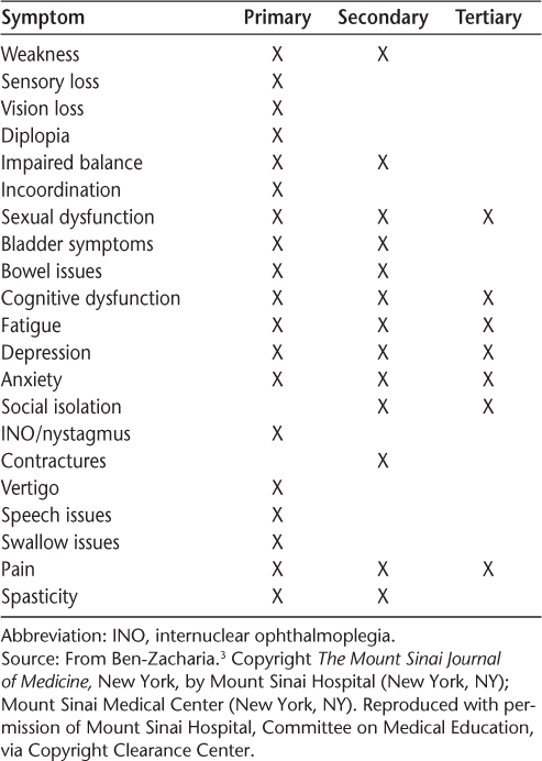 Symptoms of MS may be identified as primary, secondary, or tertiary (Table 1).3 Primary symptoms are directly related to demyelination and axonal loss; examples include vision loss and bladder dysfunction. Secondary symptoms are indirectly related to MS—for example, knee pain due to chronic genu recurvatum in a patient with a spastic monoparesis. Tertiary symptoms are the result of social and psychological effects of MS. For example, social isolation may occur as a result of depression or of bladder or bowel dysfunction.3