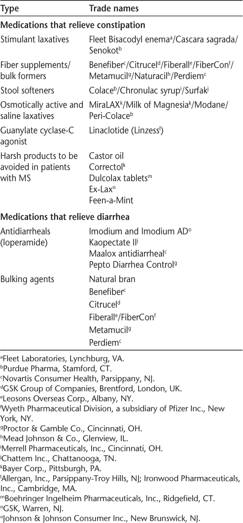 Lifestyle modifications are helpful for bowel dysfunction in people with MS (Table 5). There are various over-the-counter (OTC) medications to help relieve constipation and diarrhea (Table 6). The bowel algorithm (Supplementary Figure 2)19 provides additional information for evaluation and treatment of bowel dysfunction in people with MS. A professional needs to be involved in helping patients select appropriate OTC medications. Patients should be cautioned about overuse because electrolyte abnormalities may occur with these medications. The goal of bowel management is to establish a regular bowel evacuation schedule, which may incorporate adequate intake of food and fluids, the addition of pharmacotherapeutics (OTC or by prescription), and collaboration and planning by the patient, the family, and an MS clinician. When the goal is difficult to achieve, referral to a gastrointestinal specialist may be indicated. Management recommendations may be found in the publication by Giesser12 and in the 2012 International Journal of MS Care supplement.19