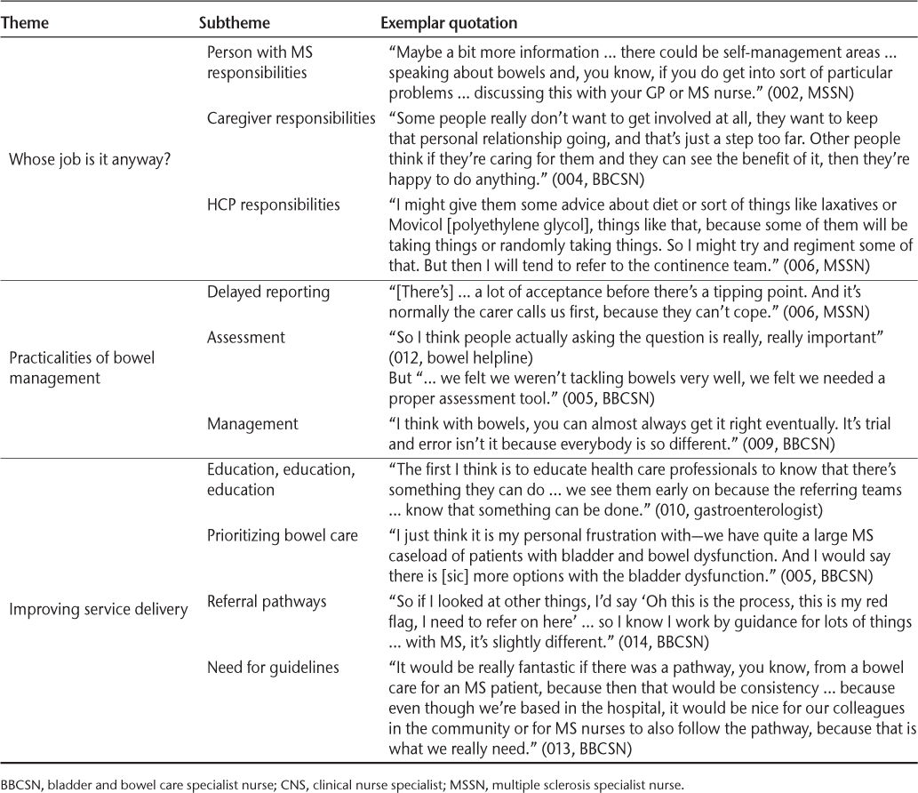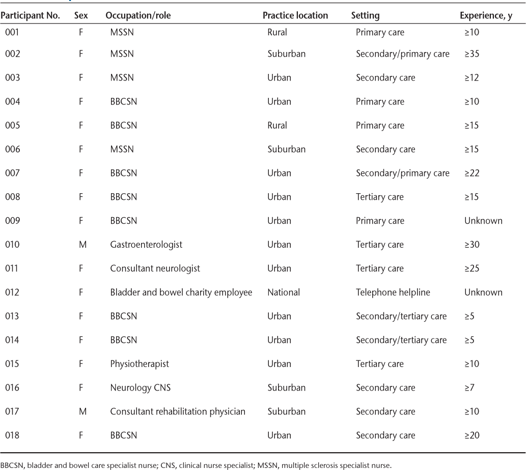 Interviews were conducted with 8 bladder and bowel care specialist nurses (BBCSNs), 4 MS specialist nurses (MSSNs), 1 neurology clinical nurse specialist, 1 gastroenterologist, 1 physiotherapist, 1 representative of a bladder and bowel charity, 1 neurologist, and 1 rehabilitation medicine consultant (Table 1). Verbatim quotations are given to illustrate findings, with participant number and role in parentheses.