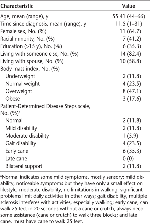 The study inclusion criteria included a self-reported diagnosis of MS, the ability to communicate over the telephone, and age older than 18 years. Participants were recruited via flyers distributed at support groups and National Multiple Sclerosis Society events. The sociodemographic characteristics and self-reported body mass index of the 17 participants are reported in Table 1.