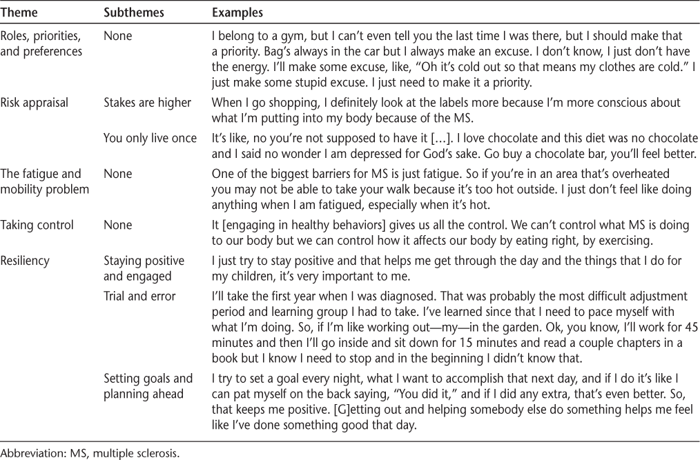 Participants who were motivated to engage in multiple health behaviors often described feeling obligated or having a sense of “ought to” because of their MS. They felt that engaging in multiple health behaviors was a strategy to manage their symptoms and maintain their independence and was consistent with their self-identity. Many felt that it was more important to engage in healthy behaviors compared with people without MS. Michelle said, “When we don't do healthy behavior, eating right, exercising, staying social, things like that, it affects us even harder.” Alternatively, other participants noted that although engaging in healthy behaviors was important, it was equally important to enjoy life, and they felt obligated to “live life to its fullest.” This meant occasionally eating unhealthy foods, staying up late, or participating in sedentary activities. When Melissa was asked about difficulties engaging in healthy behaviors, she said, “So, today the solution for me as far as living with the MS is live this day to the fullest, because it might be my last day of independence because I never know when it's gonna come.”