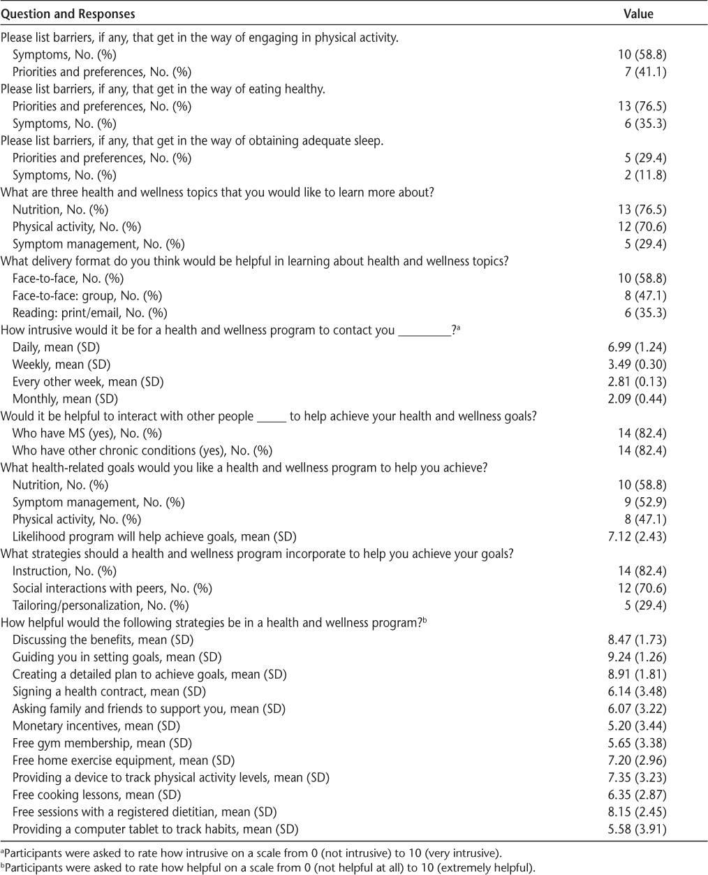 Responses to closed-ended questions are presented in Table 3. We found a variety of topics that participants wanted to learn about and a variety of goals that they wanted to achieve based on their unique circumstances. For example, when we probed participants about whether weight management strategies should be included in a health and wellness program, responses depended on whether the participant perceived that they were overweight and on whether they had a desire to lose weight. Participants also preferred a variety of different delivery formats, but most agreed that weekly or every-other-week intervention contacts would not be too intrusive. Participants thought it would be useful to interact and learn from people with and without MS. Several participants felt that education about the benefits of engaging in health behaviors, guidance in setting and achieving goals, sessions with a dietitian, and free home exercise equipment and devices to track physical activity levels would be helpful to include in a health and wellness program. Participants thought it would be less helpful to include monetary incentives, gym memberships, and health contract signings.
