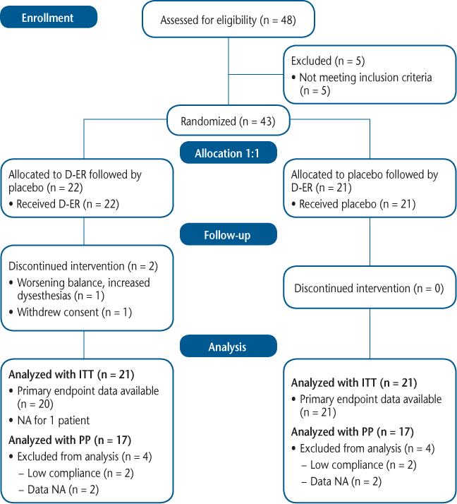 After screening, eligible participants returned 2 weeks later (week 0) for randomization (Figure 1). They then entered a 4-week, double-blind, placebo-controlled period. Active and placebo drugs were provided by Acorda Therapeutics (New York, NY) and appeared identical. Treatment with D-ER was 10 mg twice a day, and participants were instructed to take one blinded tablet (supplied in appropriate quantities at each clinic visit) approximately every 12 hours during the treatment phase. At week 6, participants entered a second 4-week double-blind period during which they were allocated to receive the opposite treatment from that during the initial 4-week period. The final visit was at week 10, and a telephone follow-up visit was made 2 weeks later to check on adverse events (AEs).