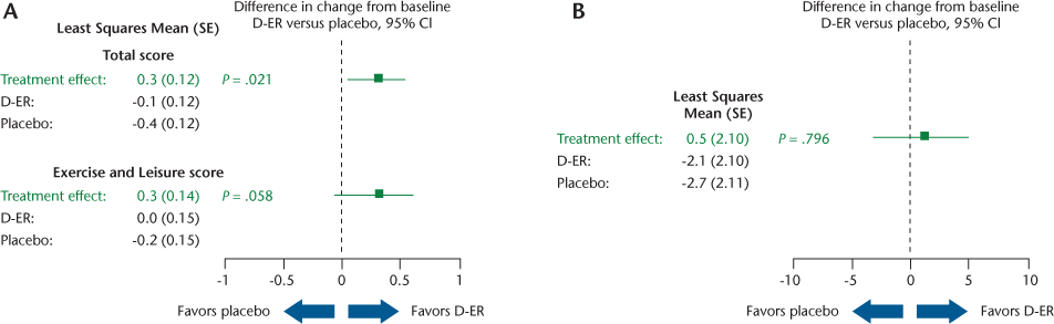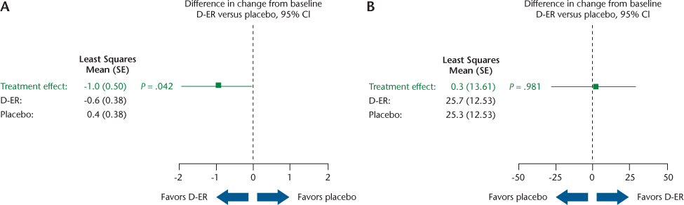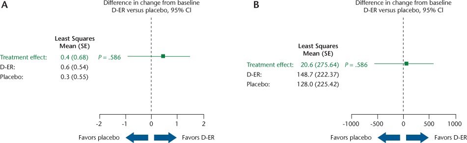 Results for the key outcomes (Table 2) are illustrated in Figures 2, 3, and 4 as forest plots that present the point estimate and 95% confidence interval for the difference in change from baseline for D-ER relative to placebo; a confidence interval that crosses zero indicates no significant difference between treatments.
