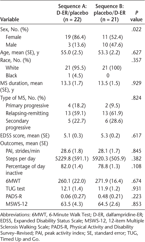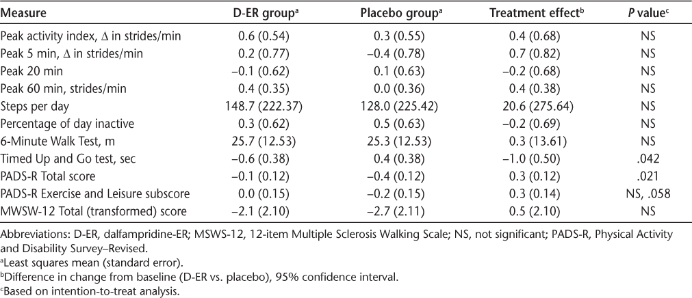 Results: Forty-three participants were randomized (mean Expanded Disability Status Scale score, 5.17). Least squares mean (standard error) change from baseline on the PAI was 0.6 (0.54) strides/min on D-ER and 0.3 (0.55) strides/min on placebo and in daily step count was 148.7 (222.4) on D-ER and 128.0 (225.4) on placebo. Other accelerometer-based measures and the 6MWT showed no significant differences between D-ER and placebo. The TUG test (P = .042) favored D-ER. There were no serious adverse events.