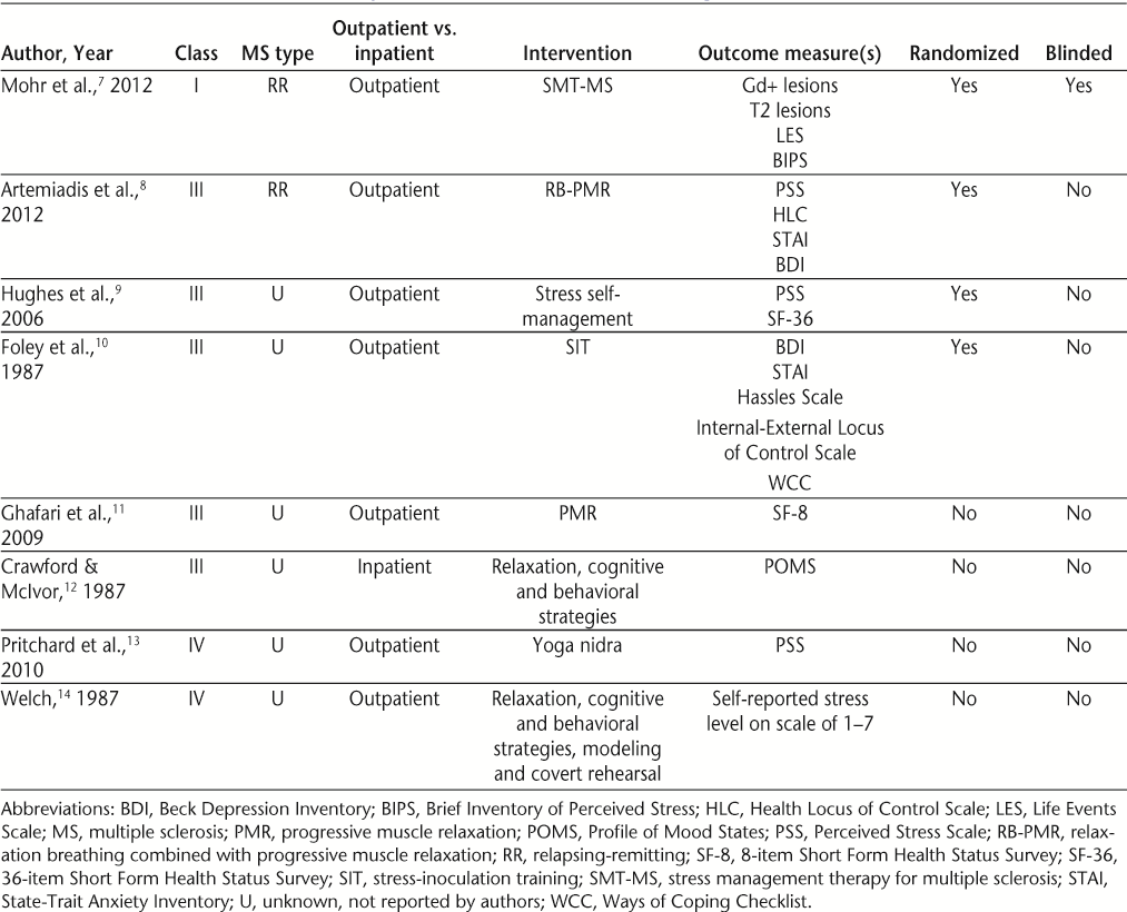 Conclusions: The promising findings for stress-management interventions highlight the need for future studies. Additional large, prospective, multicenter studies will help to define the role of stress-management interventions in the treatment and course of MS. Furthermore, including outcome measures based on biological and clinical markers of disease will prove useful in understanding potential underlying mechanisms.