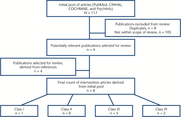 Searches were conducted in databases including PubMed, CINHAL (EBSCO Publishing, Glendale, CA), COCHRANE, and PsychInfo through February 2013 to identify articles that reported on stress-management interventions for people with MS. Stress-management interventions were defined as psychological techniques employed to support MS patients in reducing emotional or physiological responses resulting from stressful events (including stress related to the disease process). The headings “multiple sclerosis” and “stress, psychological” were used in addition to the following subheadings: “psychology,” “therapy,” and “prevention and control.” Articles included were published in peer-reviewed journals in the English language. Cited references to full-text articles were also reviewed to identify additional intervention studies. The following criteria had to be met for inclusion in the systematic review: a) the intervention included techniques to decrease stress or improve management thereof, and b) the study's sample consisted in part or entirely of individuals with MS. A diagram of the literature retrieval process and breakdown by classification is shown in Figure 1. Most of the articles in the initial pool of publications were reviews or case reports or did not meet our search criteria.