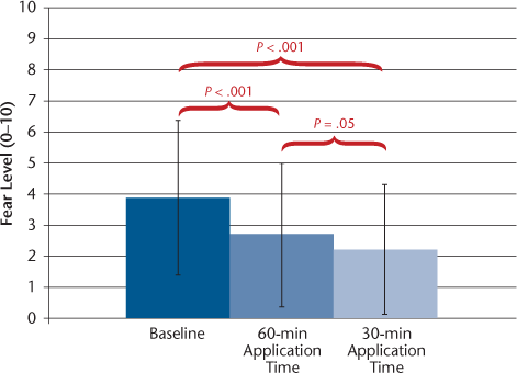 Mean ± SD visual analogue scale scores for fear of injection at baseline and with 60- and 30-minute Synera topical adhesive application times
