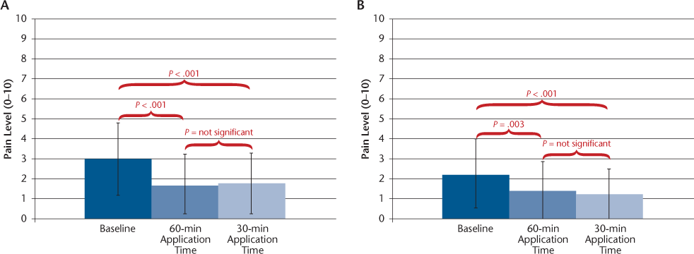 The primary outcome found pain-on-injection reductions of 2.6 (46%) and 2.7 (47%) on the 11-point VAS with 60- and 30-minute S-TA application times, respectively. Twelve- and 24-hour pain reductions were lower, but still greater than 35% with both 60- and 30-minute applications. The FOI was significantly reduced and SGI scores were significantly improved for both application times, suggesting that changes in pain ratings were meaningful. Two studies of patients with various painful conditions suggested that 30% to 33% changes in pain intensity or 2-point reductions in the raw change on an 11-point pain scale may be regarded as clinically meaningful.8,9 However, meaningful change criteria do not exist specifically for injection pain.