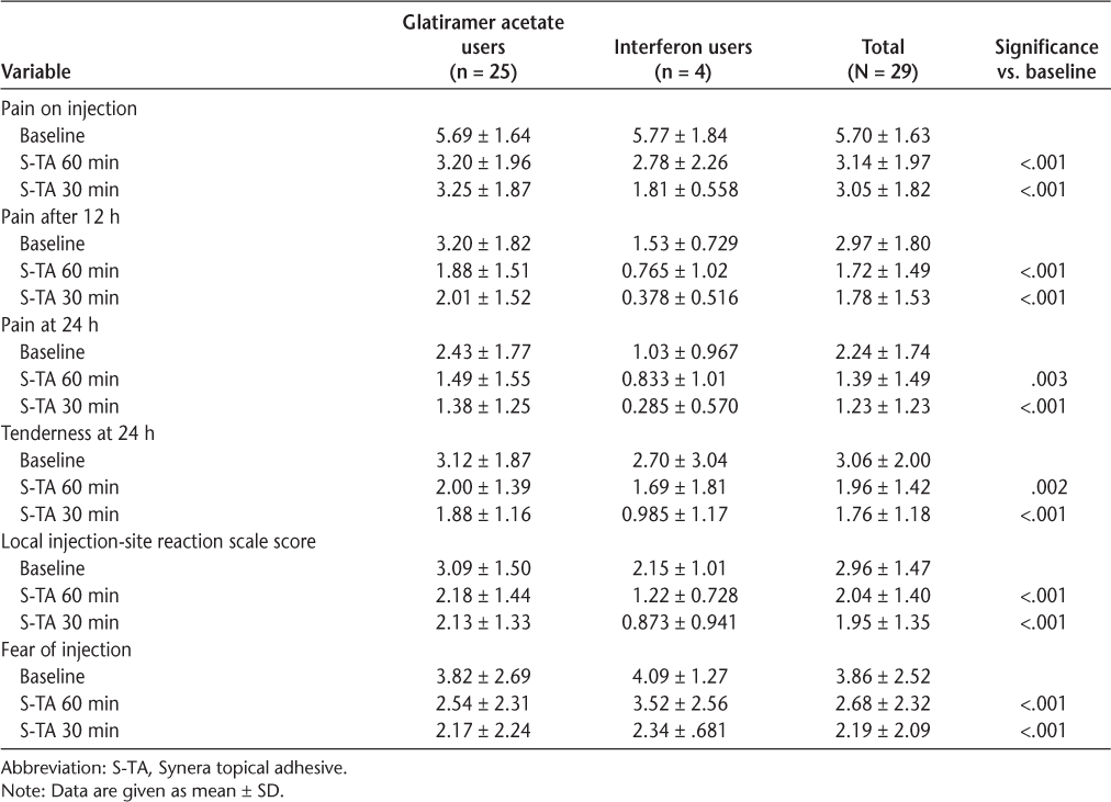 Results: Twenty-nine participants completed the study (interferon beta = 4, GA = 25, mean age = 51 years, females = 86%). There were significant reductions in injection pain, pain at 12 and 24 hours, tenderness at 24 hours, local injection-site reaction scale scores, and FOI for the 30- and 60-minute applications of S-TA (all P < .01). Results were similar in the GA subgroup. Adverse events included muscle spasm and lightheadedness (n = 1) and mild dermatitis (n = 1).