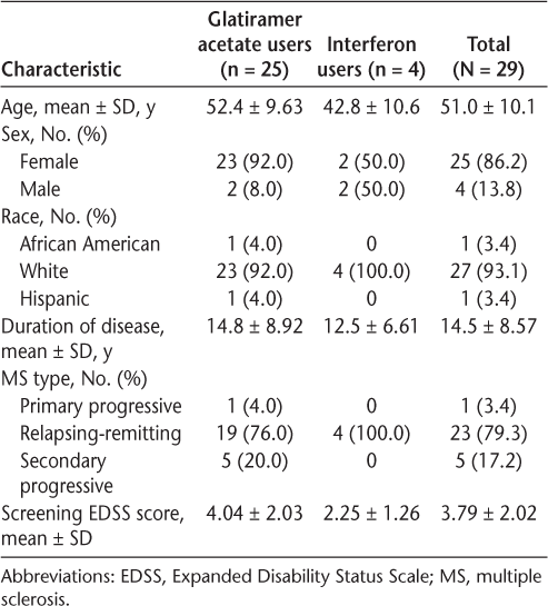 Thirty participants were enrolled, with seven screen failures due to low pain scores (n = 5), withdrawal of consent (n = 1), and an incomplete diary (n = 1). One participant withdrew early, and 29 participants completed the study and had data available for efficacy analyses: 19 taking GA 20 mg, 6 taking GA 40 mg, and 4 taking IFNβ (3 taking IFNβ-1a subcutaneous and 1 taking IFNβ-1b subcutaneous). For participants who completed the study, the mean age was 51 years, 86% were women, 79% had relapsing-remitting MS, and the mean Expanded Disability Status Scale score was 3.8 (Table 1). Adherence to S-TA therapy was 98.4% based on returned supply counts.
