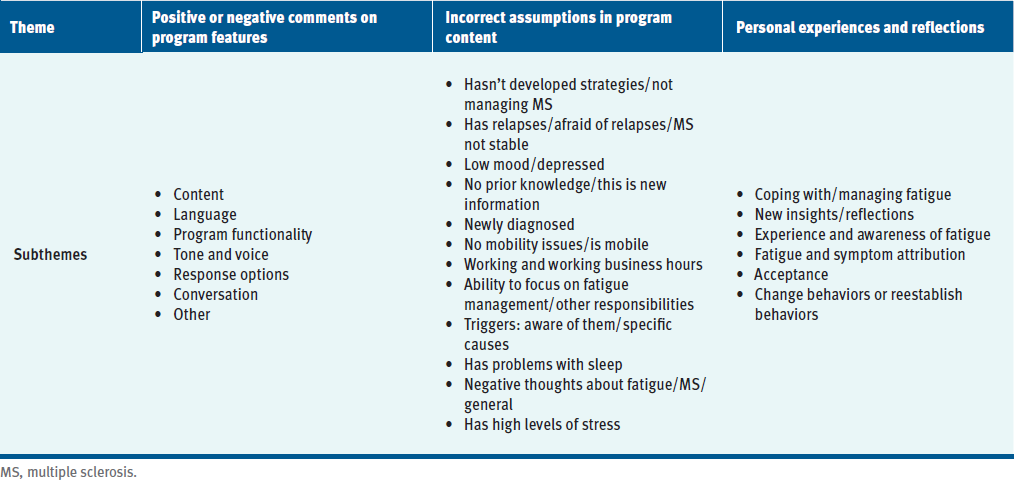Although the benefits of CBT-based approaches to MS-related fatigue have been shown,7-9 this study has indicated the importance of considering various factors relating to how people with MS-related fatigue engage with and respond to the content of CBT-based programs. For example, the lived experience of MS-related fatigue could relate to many factors, including time since diagnosis, type of MS, access to resources and support, and/or the impact of the symptoms of MS-related fatigue on motivation and behavior.2,21,22