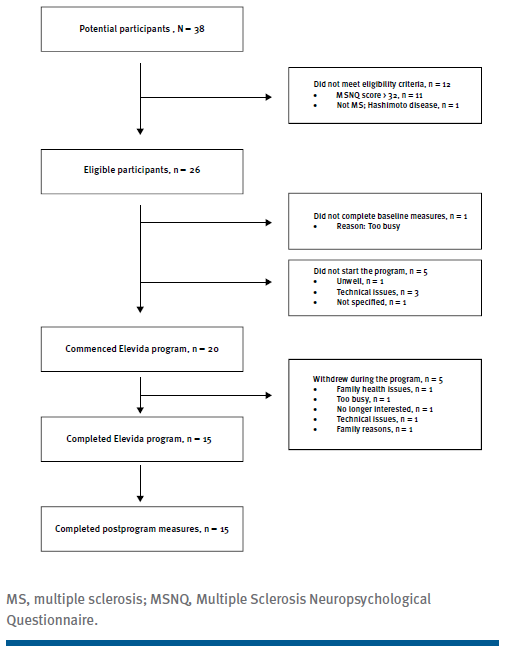 Participants were enrolled from January 2020 to July 2020 (ie, much of the study occurred during the COVID-19 pandemic). The Elevida study design flowchart is shown in FIGURE 1, and participant baseline characteristics are documented in TABLE S2. Of 38 respondents, 26 were eligible to participate. The 12 individuals with MS who did not meet eligibility criteria did not differ in age range (P = .6) from those who were eligible, but had significantly higher self-reported cognitive difficulties (MSNQ, P < .01) and levels of fatigue (FSMC, P < .01). Of the 20 people who commenced the program, 15 completed it (see Figure 1 for reasons for noncompletion).