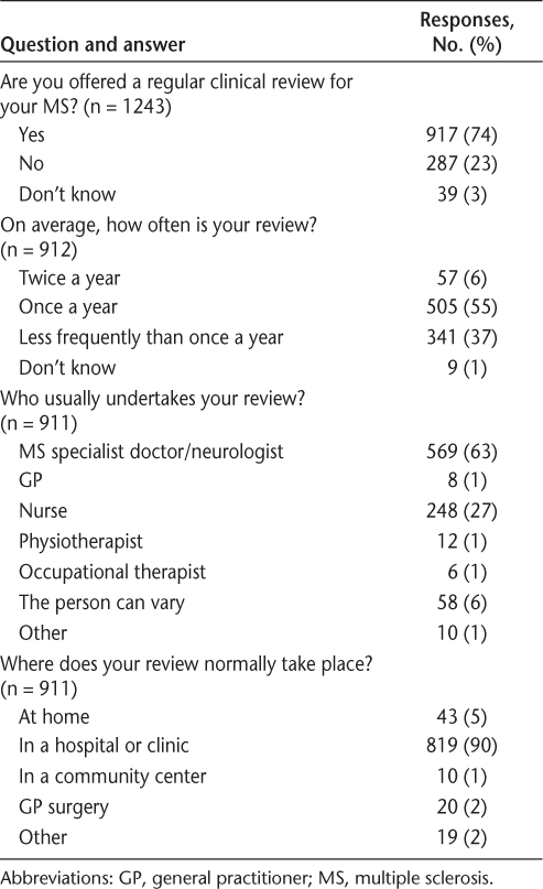 In total, 917 of 1243 participants (74%) received a regular review; 505 (55%) received that review annually. Of 911 respondents, 569 (63%) had their review performed by an MS specialist doctor, and 248 (27%) reported that it was performed by a nurse. A total of 819 of 911 participants (90%) reported usually receiving their review in a hospital or clinic (Table 2). Ninety percent of participants who were currently taking a DMT received a regular review: 6% received their review twice a year, 51% once a year, 41% less frequently than once a year, and 2% did not know (data not shown).