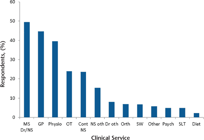 Use of clinical services in this study's participants was high. The three most used clinical services were MS specialist nurses or doctors, general practitioners, and physiotherapists (Figure 2). This finding was similar to two previous studies surveying people with all types of MS in the United Kingdom and Europe.9 24 This may indicate that people with progressive MS are using the same kinds of clinical services as those with RRMS.