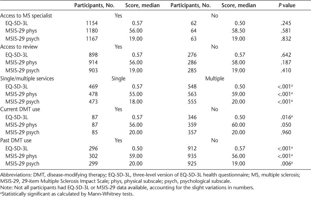 Participants who received a single clinical service, as opposed to multiple services, for their MS had a better quality of life as measured by the EQ-5D-3L index (P < .001) and less of a physical and psychological impact of MS as measured by the MSIS-29 (P < .001). Use of single or multiple services was, however, not dependent on MS type (n=1045, P = .165) or whether a participant lived in a rural or urban location (n = 1003, P = .972) (data not shown). Participants who were currently taking a DMT for their MS had a better quality of life (P = .016) than those who were not taking a DMT. Those who had previously taken DMTs, however, had a poorer quality of life (P < .001) and greater physical (P < .001) and psychological (P = .006) impacts than those who had not taken DMTs (Table 4). There were no differences in quality of life and disease impact scores between those who did and did not have access to an MS specialist or access to a review, and there was no difference in the psychological or physical impact of MS between those who were and were not currently taking a DMT (Table 4).