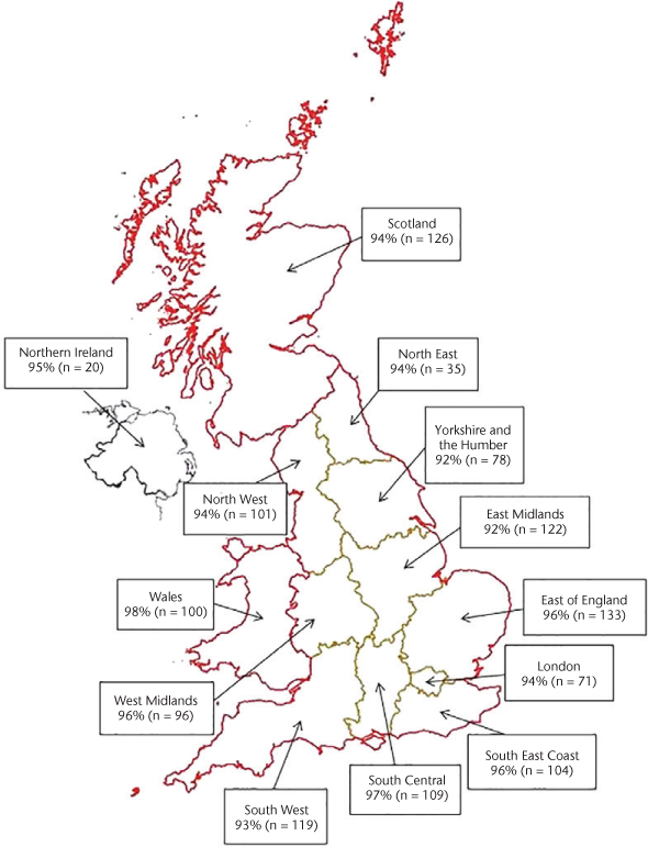In this sample of 1298 individuals with MS, access to an MS specialist was high (95%) and was similar across the United Kingdom (Figure 1). This was slightly higher than the outcome of a survey performed by the MS Society in people with all types of MS in the United Kingdom that reported that 86% of participants had access to a neurologist or MS nurse.10 A previous study conducted in London reported a lack of access to MS-related services among those severely affected by MS11; however, the present study indicates that 95% of people with progressive MS have access to an MS specialist. This difference in results may indicate improvements in service provision since Edmonds et al.11 performed their study and that the people in this sample were not severely affected by their MS. Interestingly, there were no differences in quality of life and disease impact measures between those who did and those who did not have access to an MS specialist. However, there were relatively few people who did not have access in these analyses, so results should be interpreted with caution.