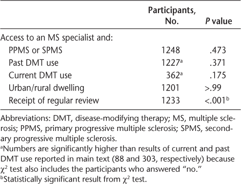 There was a significant association between access to an MS specialist and receiving a regular review (P < .001) (Table 3). Access to an MS specialist was not associated with MS type, past or present DMT use, or urban/rural dwelling (Table 3).