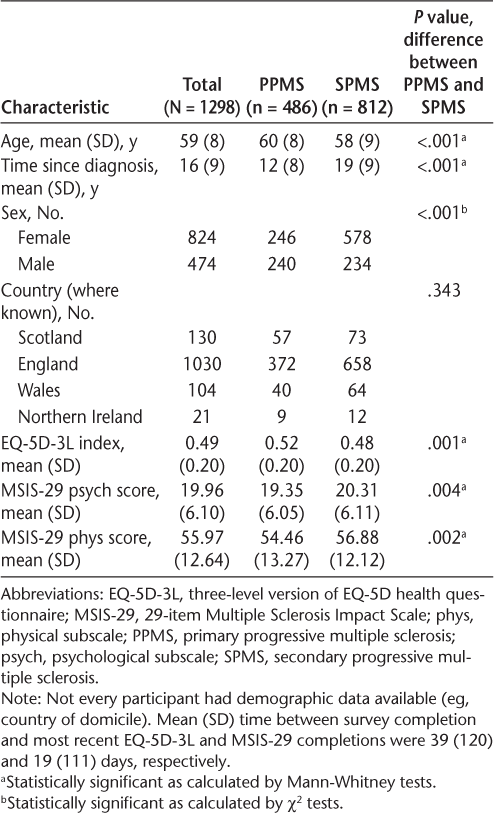 Of 2538 registrants with progressive MS who were e-mailed by the UK MS Register, 1298 completed the survey, generating a 51% response rate (England: n = 1030, Scotland: n = 130, Wales: n = 104, and Northern Ireland: n = 21 [13 participants had not supplied their geographic data to the UK MS Register]). Participants had a mean (SD) age of 59 (8) years and time since diagnosis of 16 (9) years; the female-male ratio was 1.7:1; 486 (37%) had PPMS and 812 (63%) had SPMS. The mean (SD) EQ-5D-3L index was 0.49 (0.20), indicating a poorer quality of life compared with the general population of the same age who would have an approximate index of 0.8.23 The mean (SD) MSIS-29 physical and psychological subscores were 55.97 (12.64) and 19.96 (6.10), respectively, indicating that this sample was moderately affected physically and psychologically by their MS (Table 1). Compared with those with SPMS, people with PPMS were older and had a shorter time since diagnosis, a higher EQ-5D-3L index, and lower psychological and physical scores on the MSIS-29 (all P < .005).