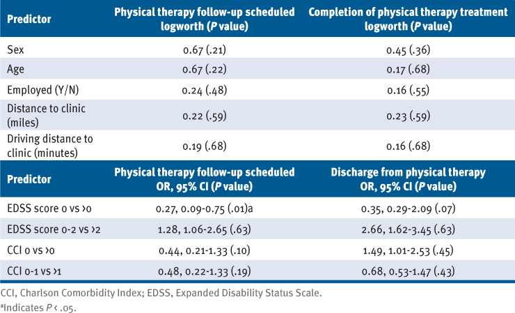Completion of physical therapy treatment was not found to be associated with demographic, disease-related, or transit-related factors (TABLE 1). However, patients with no disability (EDSS score, 0) were 73% less likely to schedule a follow-up appointment (in-person or telerehabilitation) than those with some disability (EDSS score, >0) (odds ratio, 0.27; 95% CI, 0.09–0.75; P = .012).