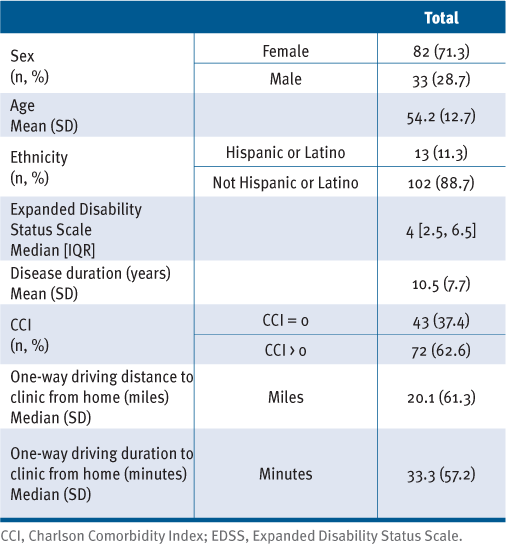 The following variables were extracted from the EHR: demographic variables (age, sex, employment status); clinical variables (Expanded Disability Status Scale [EDSS] score,23 disease-modifying therapies, comorbidities using the Charlson Comorbidity Index [CCI]); physical therapy-related variables (presenting symptom, symptom duration); and transit-related data (driving distance and time from home zip code, home zip code bike and transit score [calculated via Walk Score Research24] to reflect the quality of the cycling and public transit infrastructure).