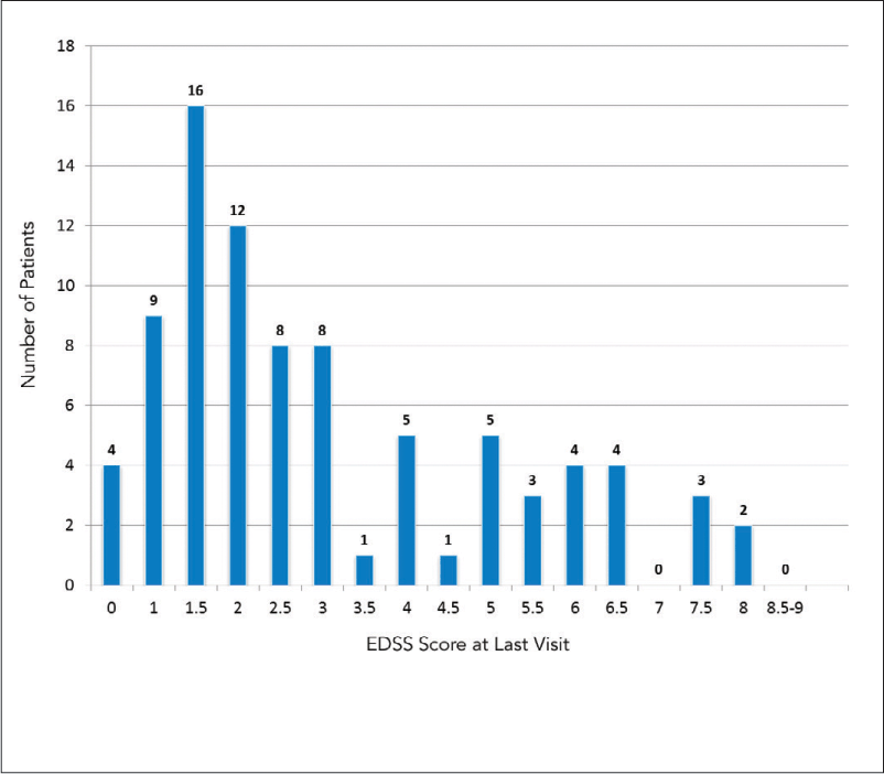 Distribution of Expanded Disability Status Scale (EDSS) scores at last visit of patients who discontinued their first-line disease-modifying therapies