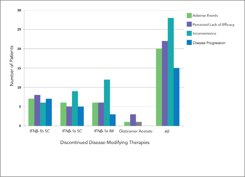 The second most common reason for nonadherence in our cohort (25.9%) was perceived lack of efficacy of the DMTs. This finding is consistent with other results published in the international literature. Tremlett and Oger29 concluded that perceived lack of efficacy was the single most common reason for interrupted interferon therapy, cited by 30% of patients. Similar figures were reported by Cunningham et al.30 (39%) and Portaccio et al.28 (29%). Setting appropriate expectations at the initiation of therapy in the context of an effective patient-provider relationship is a key factor in increasing adherence. Although all first-line DMTs have proven efficacy in reducing relapse rates and delaying disease progression, many patients are expecting their disease to be cured. Symptoms such as intermittent paresthesia, urinary urgency and incontinence, fatigue, and other paroxysmal phenomena such as trigeminal neuralgia or Lhermitte sign may be interpreted by the patient as a relapse or ongoing disease progression. Educating patients on the natural history of MS, helping them to differentiate pseudo-exacerbations from true relapses, and earlier institution of symptomatic therapy may help moderate patient expectations of therapy and improve their ability to cope with the disease.11