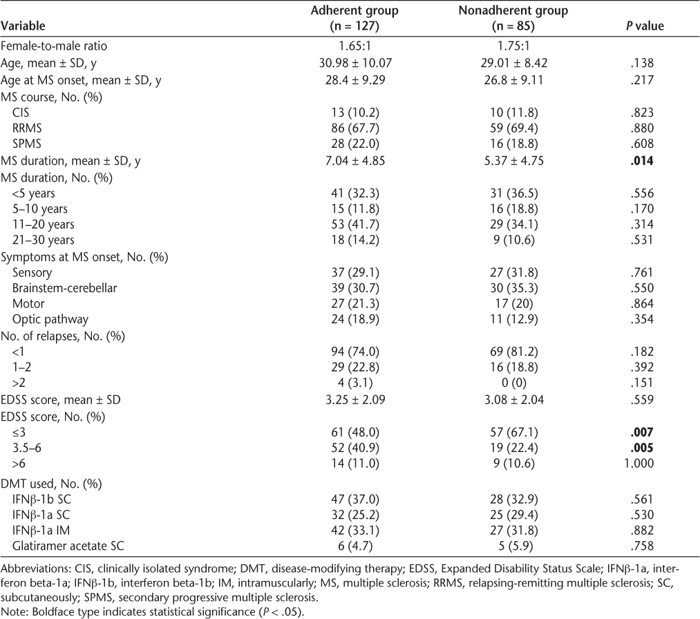 Data were expressed as mean and standard deviation. Differences between the adherent and nonadherent groups in age at MS onset, disease duration, and EDSS score were assessed with the unpaired t test. Differences between the two groups in MS course, number of relapses, symptoms at disease onset, and use of specific DMTs were assessed by means of the two-tailed Fisher exact test. The level of statistical significance was set at P < .05.