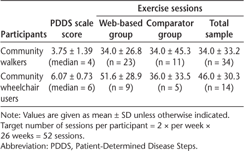 In exploratory analyses, the highest group mean ± SD number of exercise sessions was seen in community wheelchair users in the Web-based exercise group (51.6 ± 28.9) (Table 2).