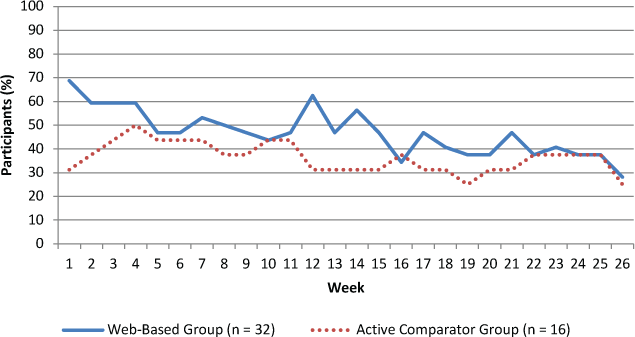 The mean ± SD number of exercise sessions for the Web-based group was 38.9 ± 28.1 and for the comparator group was 34.6 ± 40.8. The difference between group distributions for the primary adherence outcome was not significant (U = 198.5, P = .208). Hedges’ g was 0.13. Percentages of participants completing at least two exercise sessions in each week of the study are displayed in Figure 1. Considering the entire sample, almost 50% of participants (23 of 48) exercised two or more times per week for at least half of the 26-week study period.