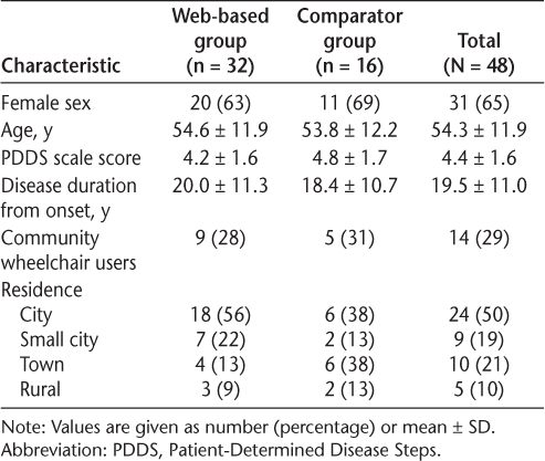 There were 48 participants: mean ± SD age, 54.3 ± 11.9 years; disease duration, 19.5 ± 11.0 years; and Patient-Determined Disease Steps scale score, 4.4 ± 1.6. There was no significant difference in mean ± SD adherence in the Web-based group (38.9 ± 28.1) versus the comparator group (34.6 ± 40.8; U = 198.5, P = .208, Hedges’ g = 0.13). Nearly 50% of participants (23 of 48) exercised at least twice per week for at least 13 of the 26 weeks. Adherence was highest in the Web-based subgroup of wheelchair users. Medium effect sizes were found for the HADS anxiety subscale and in ambulatory participants for TUG. There were no adverse events.