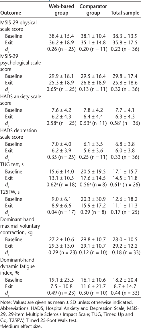 Results for most secondary outcomes are displayed in Table 3. The mean values at study exit were not worse than those at baseline, with moderate effect sizes seen for improvement in both groups for the HADS anxiety subscale (d z = 0.58) and among ambulatory participants for the TUG test (d z = 0.61). Medium effect sizes were also found for the MSIS-29 psychological scale in the Web-based group (d z = 0.65).