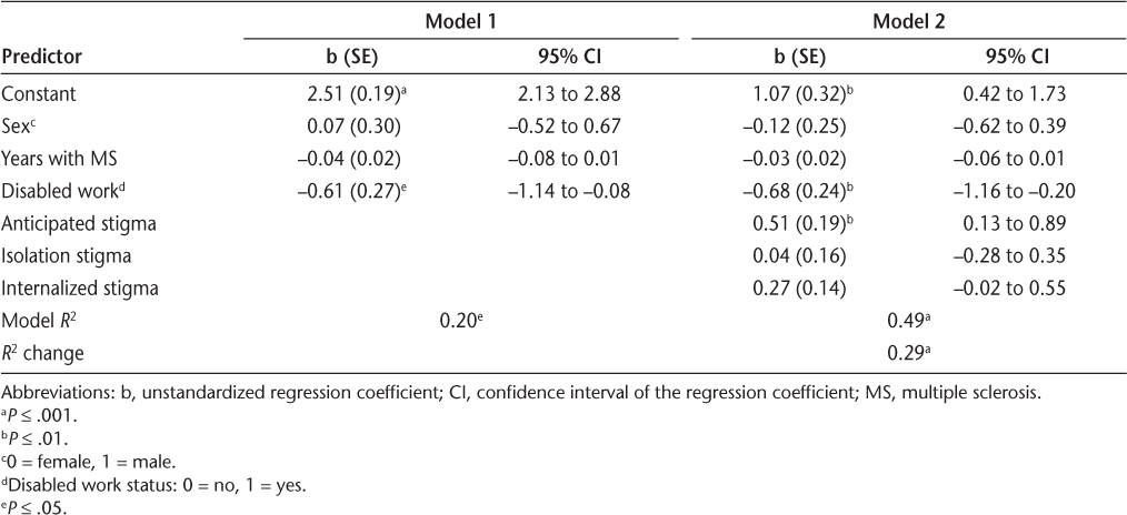 In addition to stigma, disabled work status was associated with lower concealment (b = −0.68, t 46 = −2.84, P = .007, partial η2 = 0.15, 95% CI, −1.16 to −0.20). Among the other covariates, neither sex (b = −0.12, t 46 = −0.47, P = .64, partial η2 = 0.01, 95% CI, −0.62 to 0.39) nor years since diagnosis (b = −0.03, t 46 = −1.67, P = .10, partial η2 = 0.06, 95% CI, −0.06 to 0.01) emerged as significant predictors of concealment in the complete model. Interactions were nonsignificant between the block of stigma variables and years since diagnosis (R 2 change = .01, F 3,43 = 0.29, P = .83) and disability status (R 2 change = .01, F 3,43 = 0.33, P = .80) in predicting concealment, suggesting that the association of stigma with concealment did not depend on how long participants in this sample had MS or whether the illness prevented them from working.