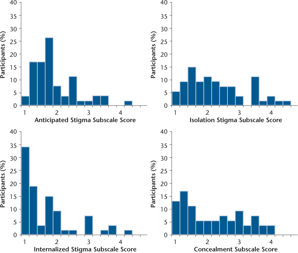 Figure 1 further shows the distribution of responses to the three stigma scales and the concealment scale. The distributions are positively skewed, but most people perceived stigma to at least some degree on all the variables. Just less than 10% of scores were above the scale midpoints for anticipated stigma and internalized stigma, whereas approximately 20% were above the scale midpoint for isolation stigma and concealment.