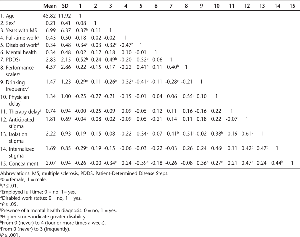 Table 1 also presents correlations between study measures. Isolation stigma was associated with disabled work status and greater impairment. Internalized stigma was associated with being younger and delaying needed physician visits. People with higher concealment scores had fewer years with an MS diagnosis and were less likely to report disabled work status, presumably because concealment is less of an option as MS progresses. Concealment was also associated with greater consumption of alcohol and delaying needed physician visits.
