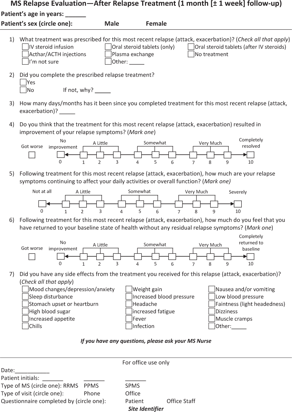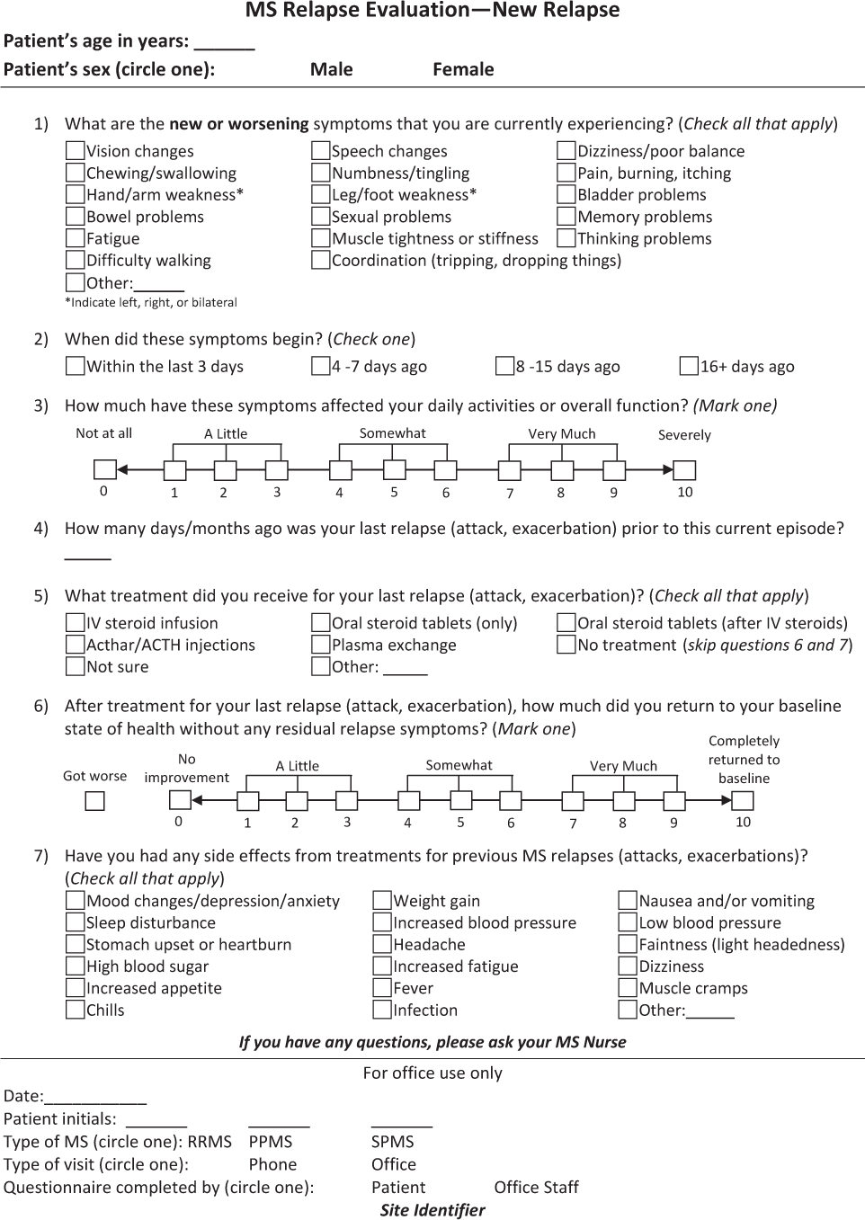 The Assessing Relapse in Multiple Sclerosis (ARMS) Questionnaire is shown in Figure 1. There are two parts to this questionnaire, with information collected at two time points. Figure 1A includes seven questions to evaluate a patient's relapse symptoms and how these symptoms affect his or her ADLs and overall function. This section also assesses the patient's response to past treatments of prior relapses and is thus a means of guiding treatment selection. Figure 1B includes seven questions to evaluate treatment response in terms of symptom relief and function, as well as treatment tolerability; this section is intended to be used approximately 3 to 6 weeks after treatment. The questionnaire can be used in MS specialty centers, general neurology practices, or other practice settings, and was designed with enough flexibility to be administered by nurses, other clinicians, or patients themselves. It lends itself to use for telephone interviews and ultimately could be incorporated into electronic health records.
