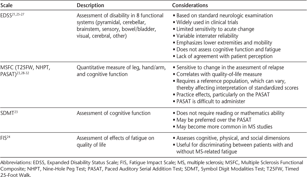 Standardized assessments used in clinical trials of MS include the Expanded Disability Status Scale (EDSS)21; the Multiple Sclerosis Functional Composite (MSFC, which comprises the Nine-Hole Peg Test [NHPT], the Timed 25-Foot Walk [T25FW], and the Paced Auditory Serial Addition Test [PASAT])22; the Symbol Digit Modalities Test (SDMT)23; and the Fatigue Impact Scale (FIS).24 Characteristics and considerations regarding the use of each scale are summarized in Table 1.21 23–32 Although use of these scales is common in clinical trials, their use in clinical practice varies, and their utility in evaluating relapse and response to relapse treatment is somewhat limited. The EDSS and MSFC are not used routinely in the context of evaluating relapses, but may be required for clinical trials, insurance authorization for coverage of DMDs, or, in some clinical settings, as standard documentation for monitoring patients over time.