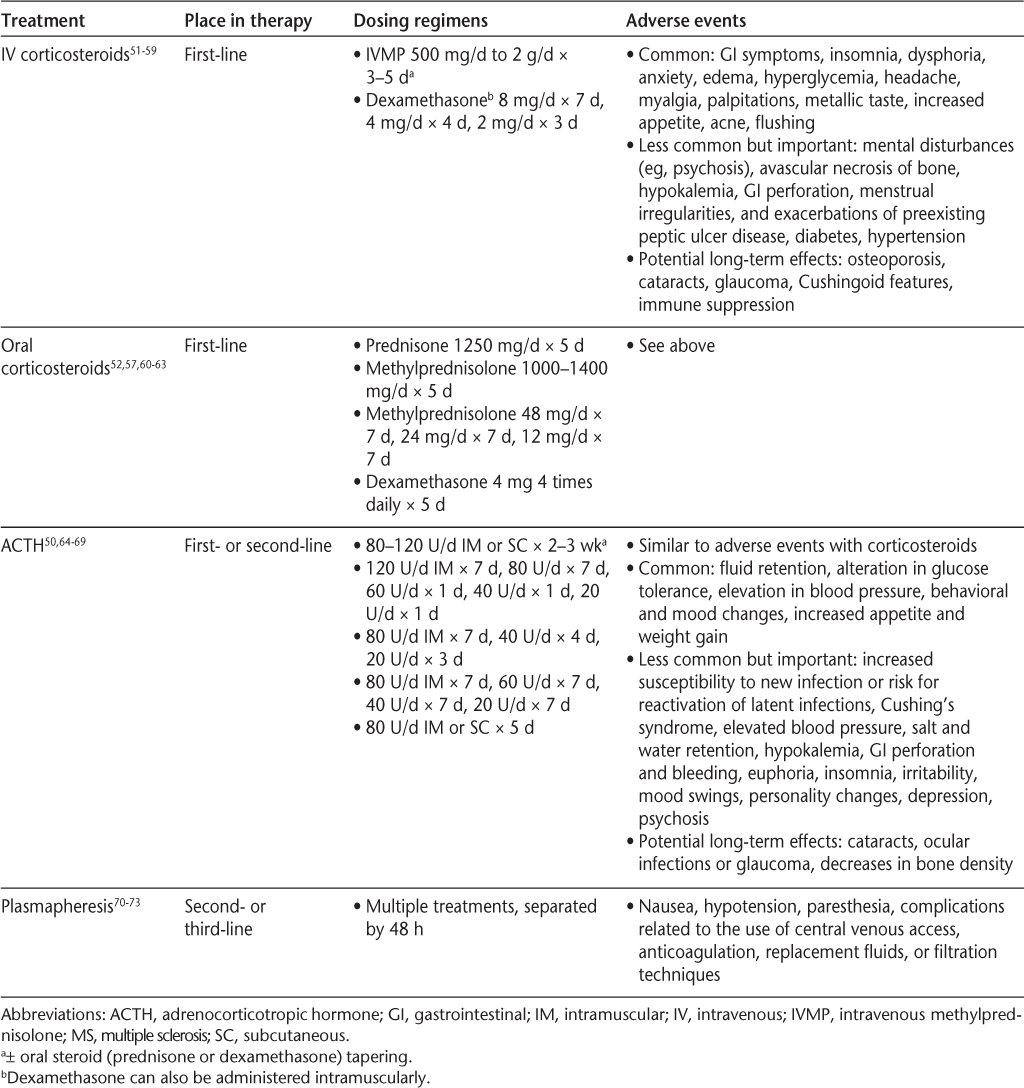 Several treatment options for a relapse—including possible dosing regimens, adverse events, and corresponding references—are summarized in Table 2,50–73 with a brief description of each of these options noted below. Detailed descriptions of the clinical trials evaluating each relapse treatment are outside the scope of this assessment-focused review. We refer the reader to a recent review by Repovic and Lublin74 for a comprehensive summary of the literature supporting the efficacy and tolerability of various MS relapse treatments.