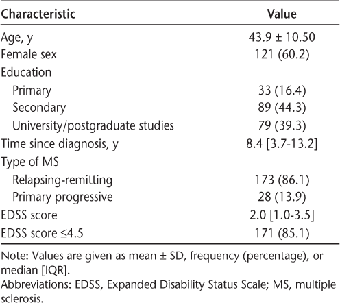 A total of 201 patients were included in the study. Patients were predominantly female (60.2%), with a diagnosis of relapsing-remitting MS (86.1%), and a mean ± SD age of 43.9 ± 10.5 years. The median SSCI-8 score was 10.0 (interquartile range, 8.0–14.0). Forty patients (19.9%) had at least one item with a score of 4 or 5, suggesting the presence of stigma “often” or “always.” The main sociodemographic and clinical characteristics of the sample are shown in Table 1.