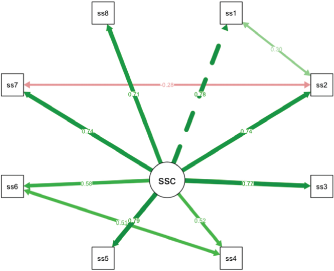 Finally, we fit a confirmatory factor analysis (CFA) model to assess the dimensionality of the SSCI-8 scale. We evaluated CFA goodness-of-fit with the comparative fit index (CFI) and the root mean square error of approximation (RMSEA). The CFI evaluates the fit of a user-specified solution with respect to a more restricted, nested baseline model (null model). The RMSEA evaluates the extent to which a model reasonably fits the population. We considered a CFI value greater than 0.95 as an acceptable model fit, and RMSEA values less than 0.08 and less than 0.05 as adequate and good model fit, respectively.16