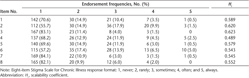 A nonparametric item response theory (IRT) procedure, Mokken analysis, was conducted to assess the dimensional structure of the SSCI-8.13,14 Mokken analysis is a scaling procedure for tests and questionnaire data that involves an item selection algorithm to partition a set of items into scales. We fit two Mokken models: the monotone homogeneity model and the double monotonicity model. The monotone homogeneity model assesses the validity of the SSCI-8 total score for ordering and classifying participants according to the level of the underlying construct. The double monotonicity model is a more restrictive model because it also assumes the existence of an implicit order among the items. Whereas the monotone homogeneity model is associated with a two-parameter logistic model with parameters for difficulty (severity) and discrimination, the double monotonicity model is associated with a 1-parameter logistic model that assumes equal discrimination across items. All items were required to have a scalability coefficient (Hi) of at least 0.30, and the overall scale a scalability coefficient (H) of at least 0.30. Mokken suggested the following thresholds for interpreting scalability coefficients: weak scale, H of 0.3 to less than 0.4; medium scale, H of 0.4 to less than 0.5; and strong scale, H of 0.5 or greater.15 The internal reliability of the SSCI-8 scale was assessed according to Cronbach and Mokken estimates.