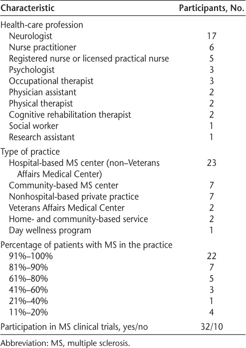 Two hundred twenty-six of the 1291 CMSC members who were contacted and whose e-mails did not bounce back (17.5%) were recorded as opening the e-mail invitation for this study, with 42 of them completing the survey. Most respondents were neurologists (n = 17) and nurses (n = 11) (Table 1). More than half of their practices (n = 22) consisted of 91% to 100% of patients with MS, and more than three-quarters (n = 32) participated in MS clinical trials. Although the age groups of their patient populations were not assessed, there was at least one provider working with children, as indicated by his or her use of pediatric measures.