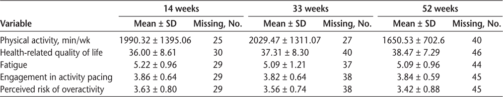 Enrolled participants were assessed through standardized measurements after rehabilitation. At each assessment point (14, 33, and 52 weeks), the measurement consisted of filling out a set of questionnaires on paper or digitally. Participants filled out an adapted version of the Short Questionnaire to Assess Health-Enhancing Physical Activity (SQUASH).17 Participants also completed the Activity Pacing and Risk of Overactivity Questionnaire,16 the Fatigue Severity Scale,18 and the RAND 12-item Health Survey (RAND-12)19 to assess their engagement in activity pacing and risk of overactivity, fatigue, and HRQOL, respectively.